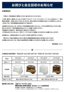 「昨日、そちらで買った風呂の椅子が割れてしまって、もう6年も前なんですが、、今日そちらで新しい椅子を買う予定なのですが、リコールプラスというサイトを見ましたら、似たような椅子が載っていて。お電話しました。」